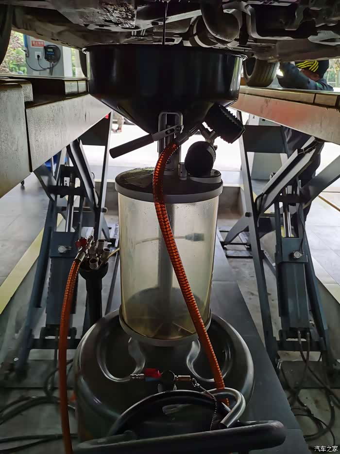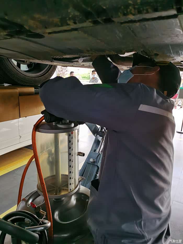 接着开始换机油机滤。车子升起来,技师在下面把机油滤芯更换了,