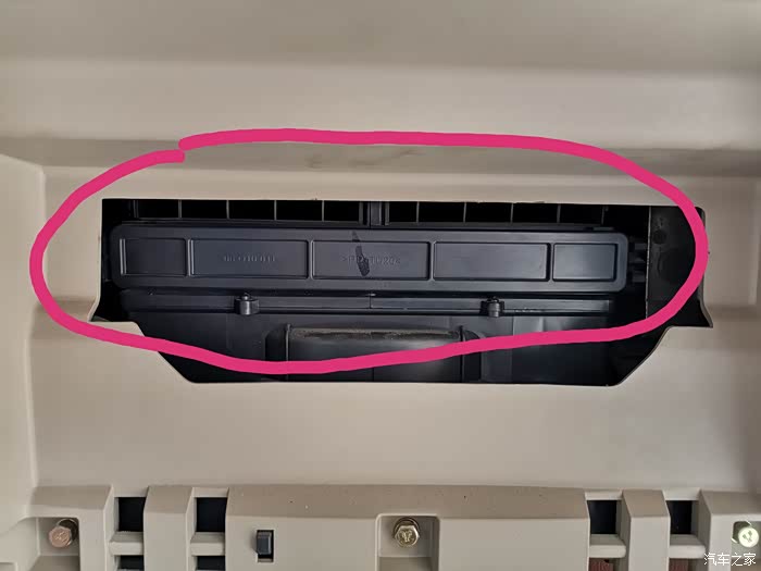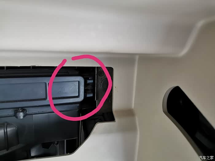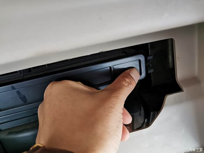 挤压后黑色盖板就弹出一边,里面能看见的白色就是空调滤芯了