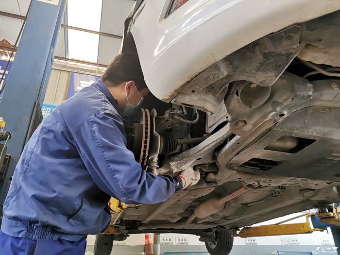 将爱车从升降机升起来后,师傅正在仔细查看