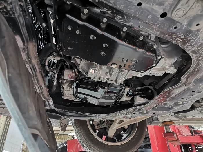 打开护板更换机油滤芯。看得到发动机和变速箱还是干干净净的,有保护的就是不一样。