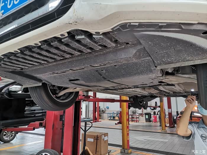 车头部分有原厂自带的护板,把发动机和变速箱都置于保护之下。师傅说天籁的护板很大,保护的很好。楼兰的都没这么好,我瞄了一眼旁边举升机上的楼兰,好像还真是。