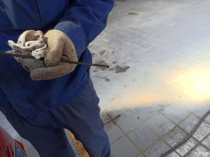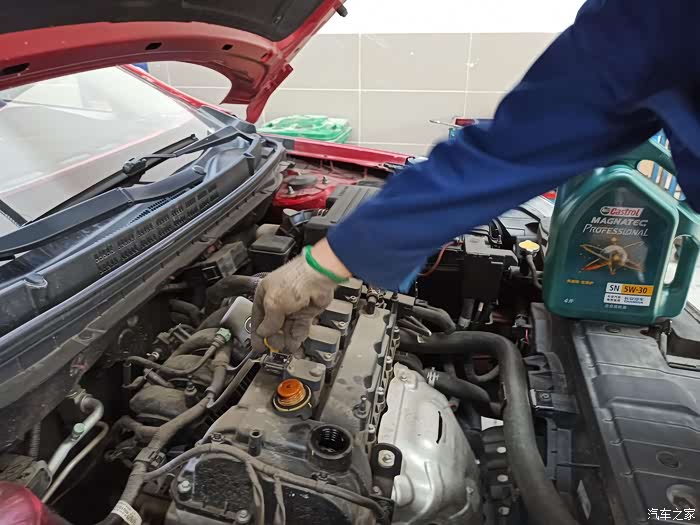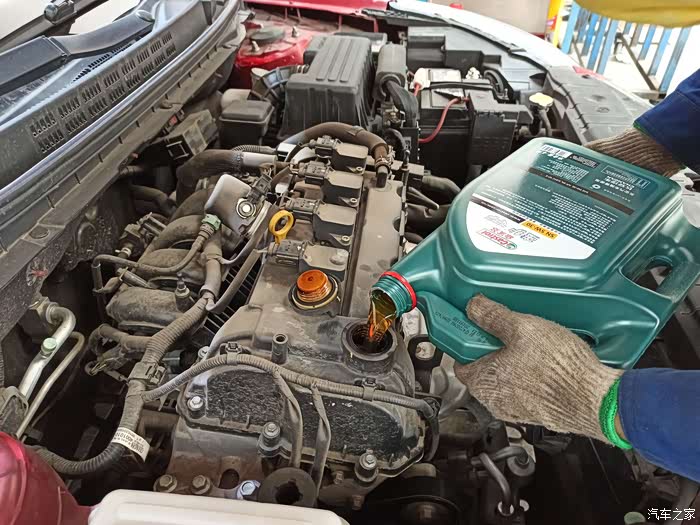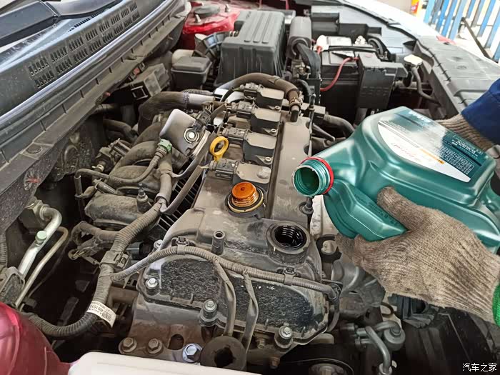 师傅的手艺不错,不借助任何工具就将机油精准的注入机油口。