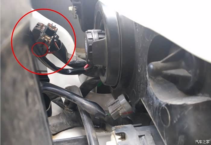 红圈里是原车H4灯插座,小红圈位置有个“按钮”,按进去就可以轻松拔下来了。