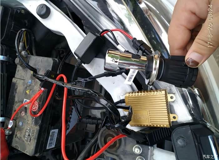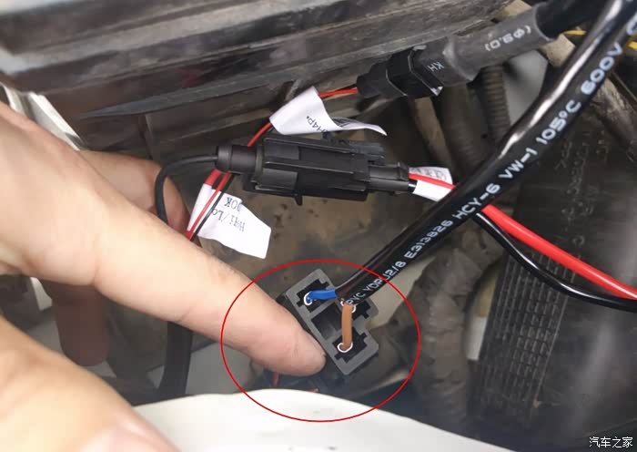 靠近电瓶那端,拔下来一个原车灯泡插座,接上氙气灯控制器插头。