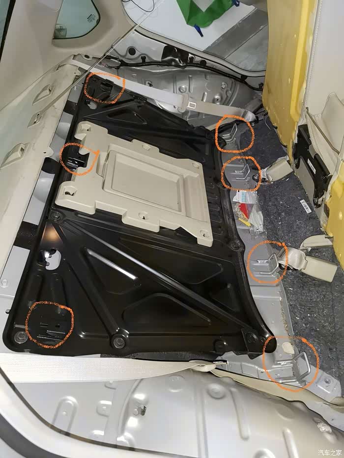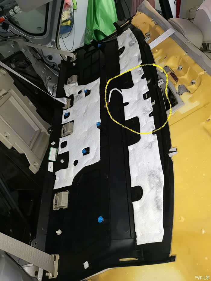 如果这个面板扒不起来,可以用螺丝刀在后排座位上,面板底部撬一下,就撬起来了。然后,黄色圈圈内就是高位刹车灯,这个圈圈内的小面板有五个 十字螺丝,拧下来就可以了。