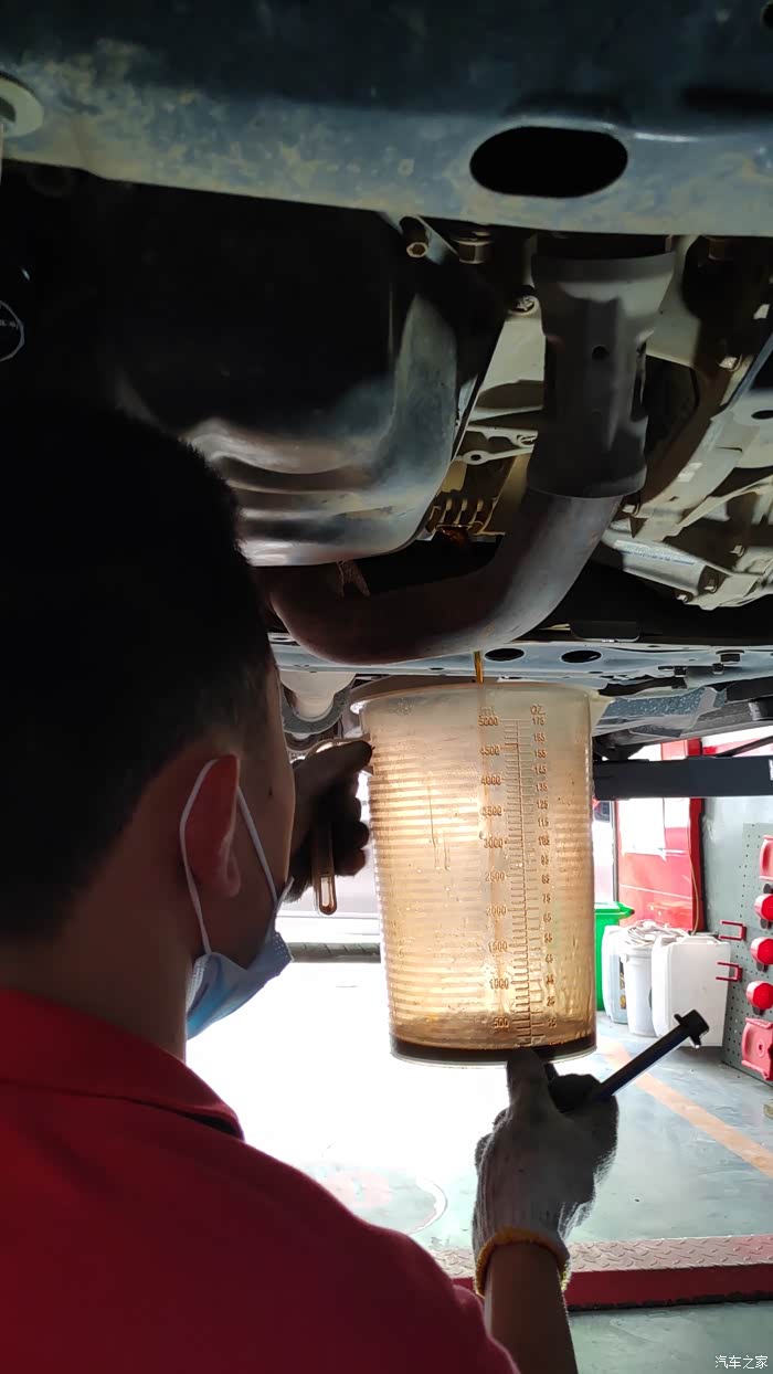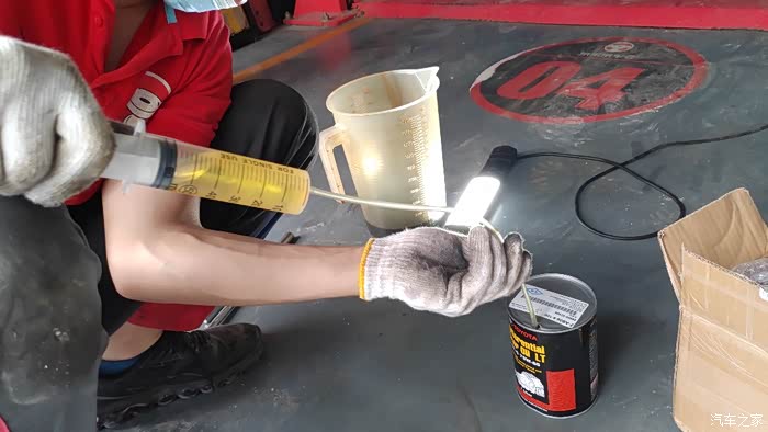 分动箱放油,后差速放油都用量杯接着,后差速器0.5升,分动箱0.5升不到,保养手册里写的是0.45升。所以用注射器加注,一点不浪费,一桶足够。加注至开始往外漏油就可以拧上螺丝了。