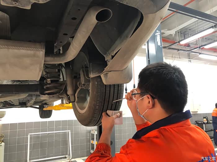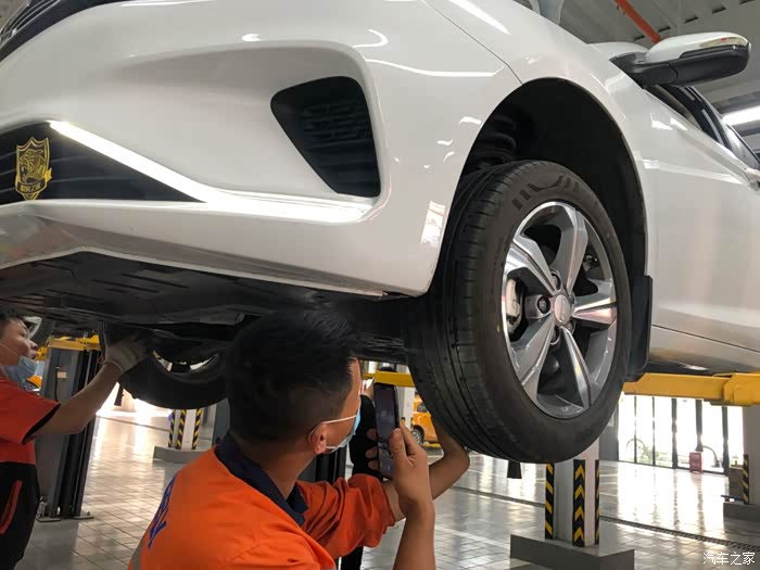 到达车间,车辆上车架进行底盘检查