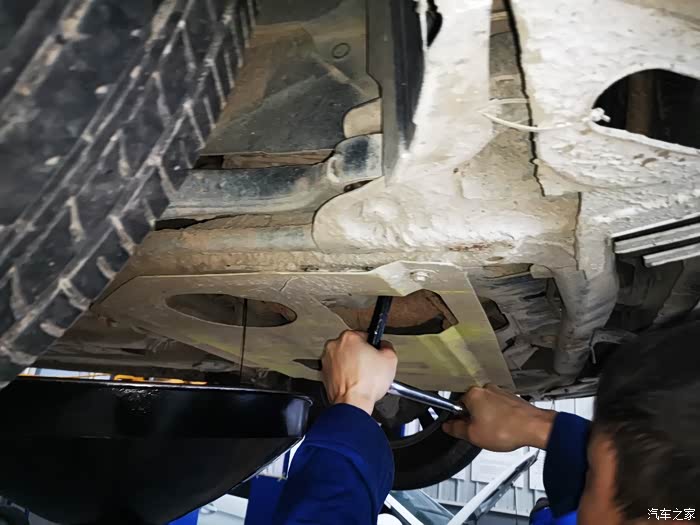 那边放机油,这边就检查底盘螺丝,挨个检查一下,加固拧紧