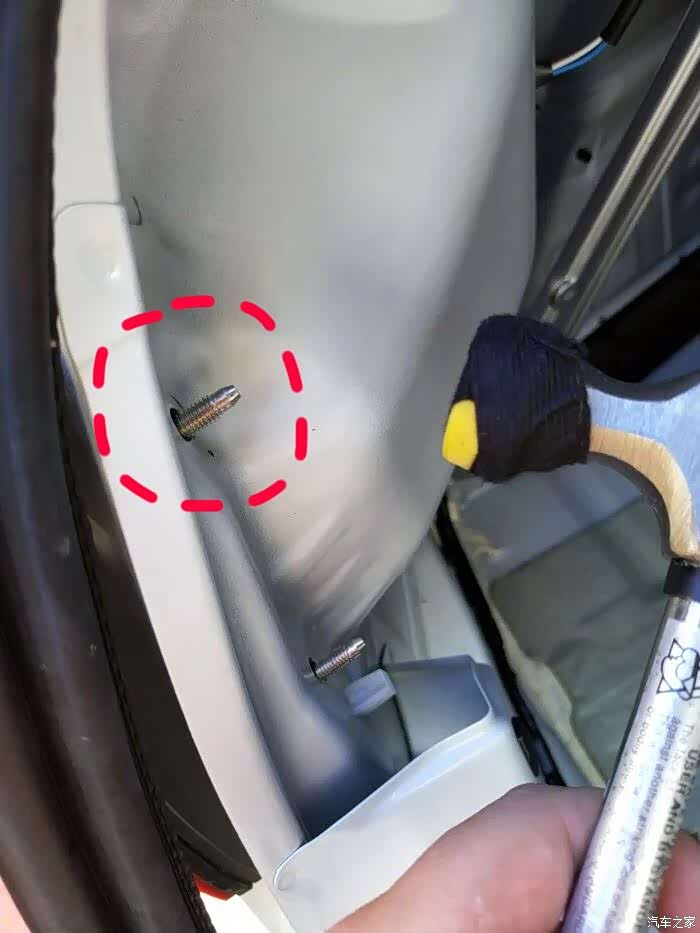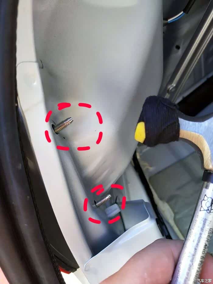 再拿锤子包上毛巾,免得伤漆。往后锤红圈部分的螺丝杆,按着尾灯的手同时往后用力,尾灯就很容易下来
