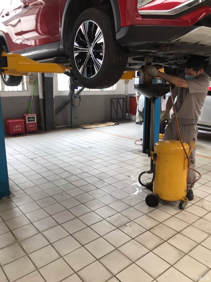 师傅首先是把车子升起来检查,并且放掉旧的机油也是得把车子升起来的