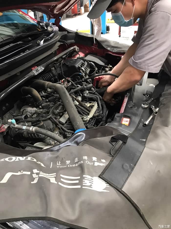 因为我是有预约的,所以也没有等太久就安排上了我进去保养,保养师傅很用心,怕刮花了我的车漆都有用布来盖着保护做事