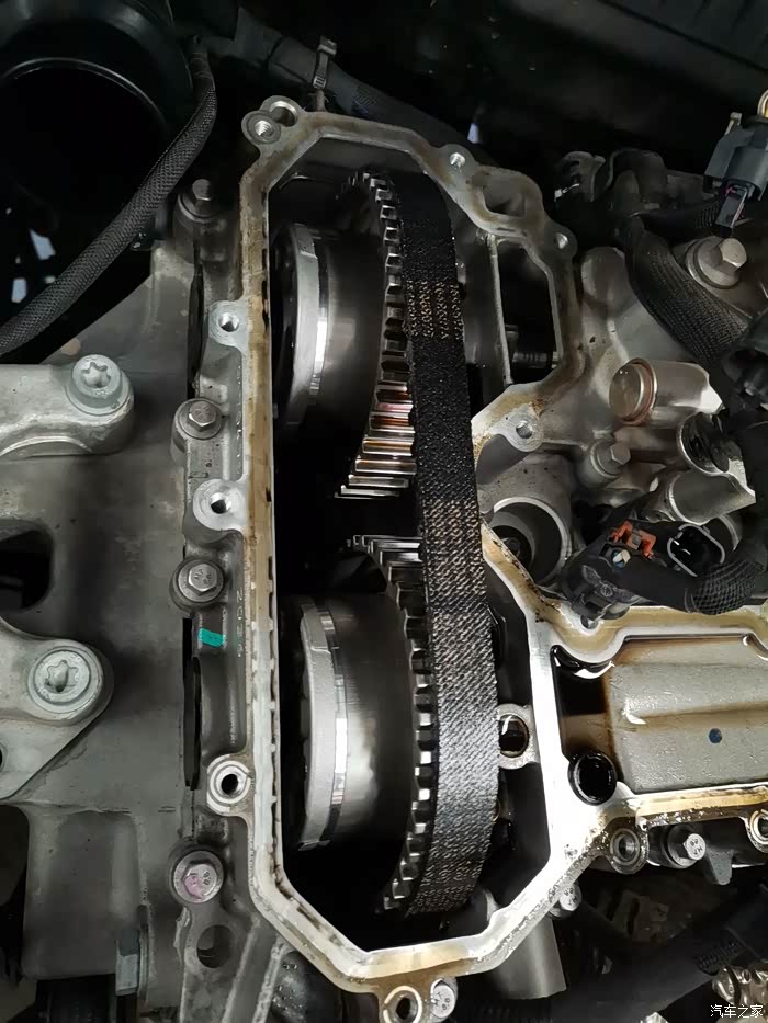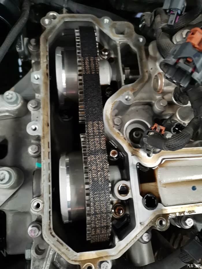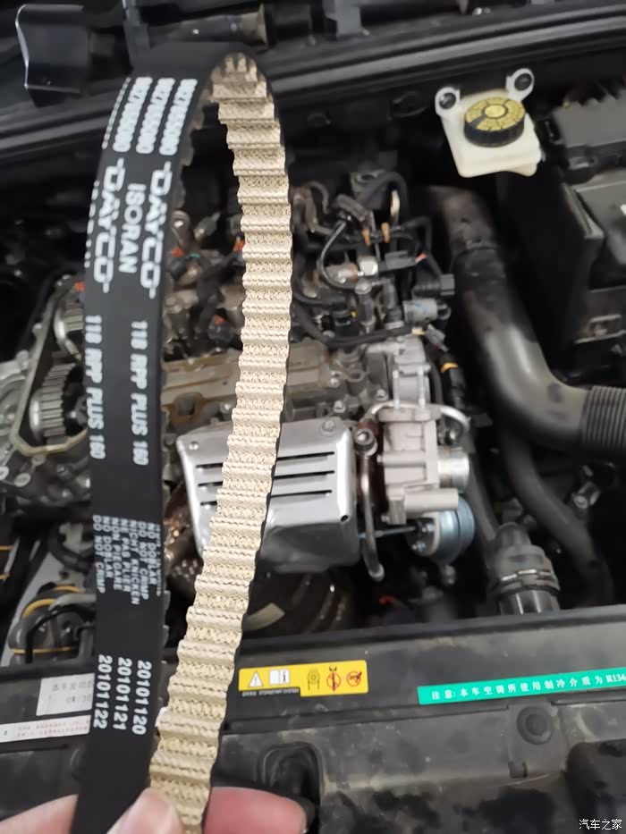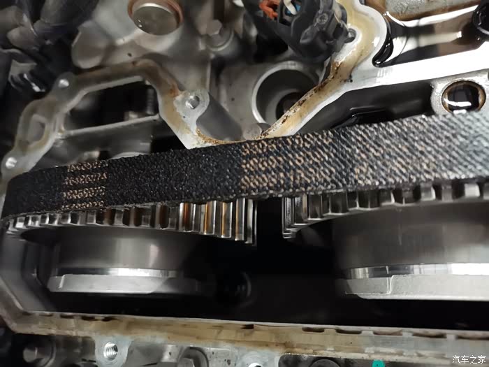 拆了20多分钟后终于看到了正时皮带,师傅说皮带很好,没有掉毛问题,皮带上零件批次号还在,估计也是因为没咋跑