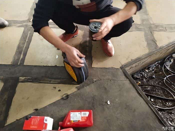 准备安装机油滤芯,师傅在紧张的操作着,把机油滤芯安装上去就可以倒机油进入发动机了