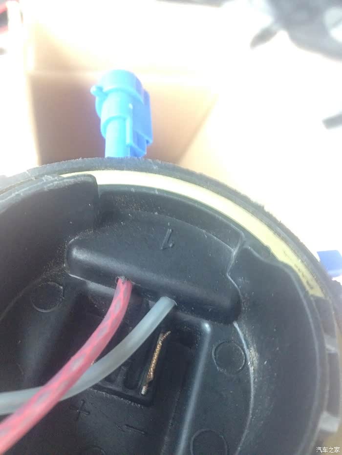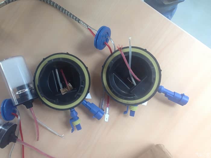 氙气灯一般两进两出,因为防尘盖的特殊只需要一进一出或者直接使用原来的线(因是高压线,本人手头工具和材料有限,不得不钻了两个小孔)