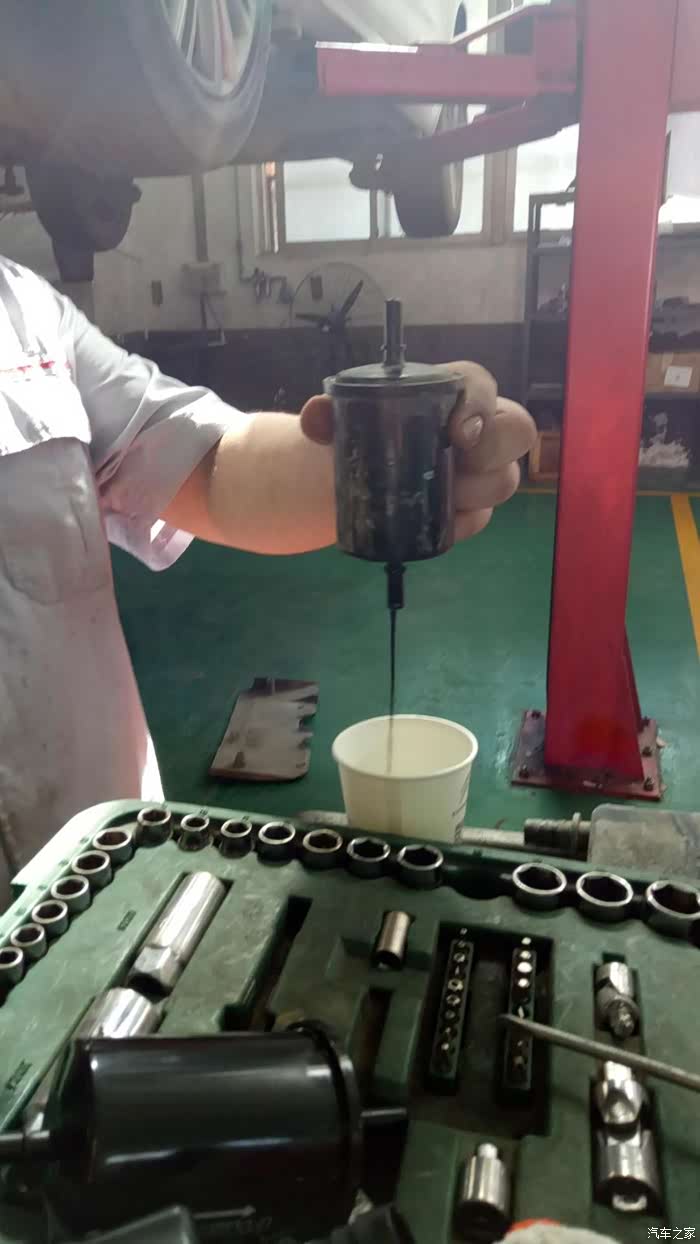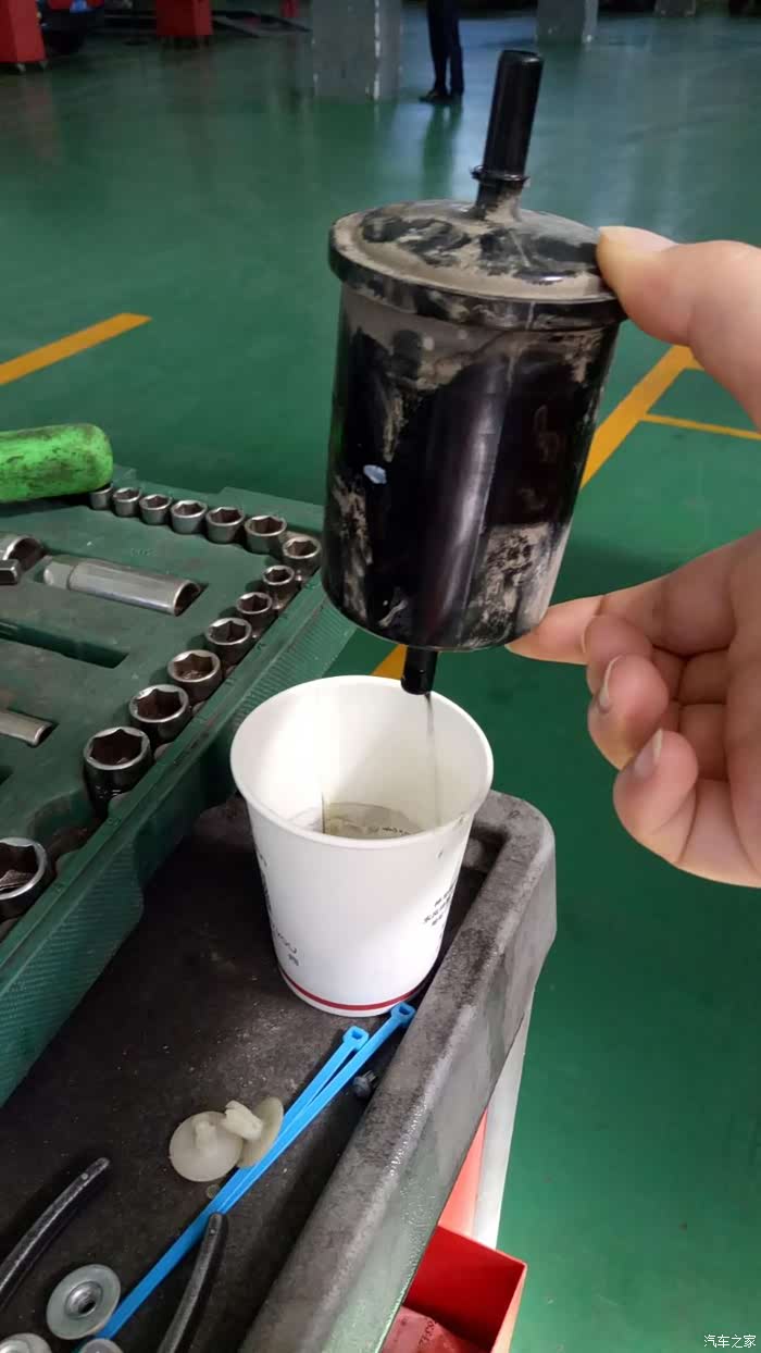 师傅手上拿的就是汽油格,师傅特地留了一点汽油在汽油格里让我看。