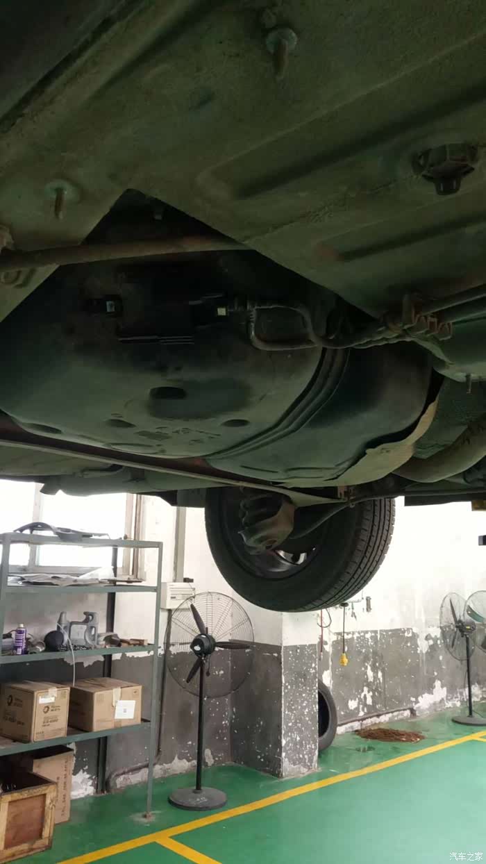 车被顶起来了,油乎乎黑色的那块位置就是汽油格的位置