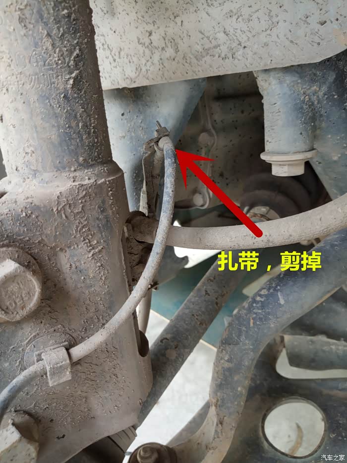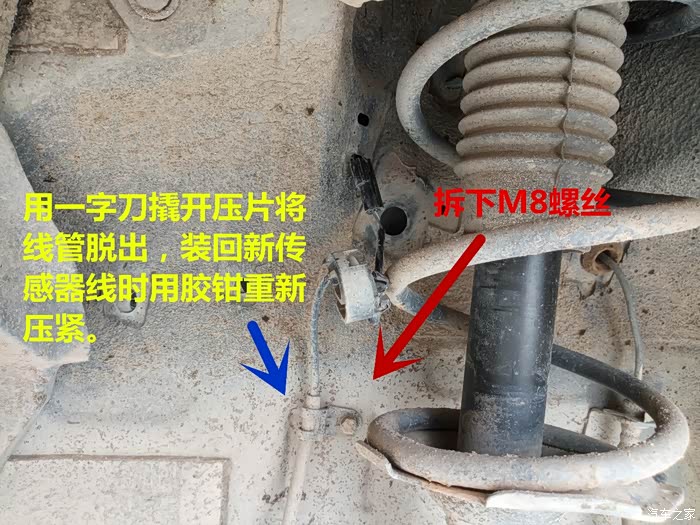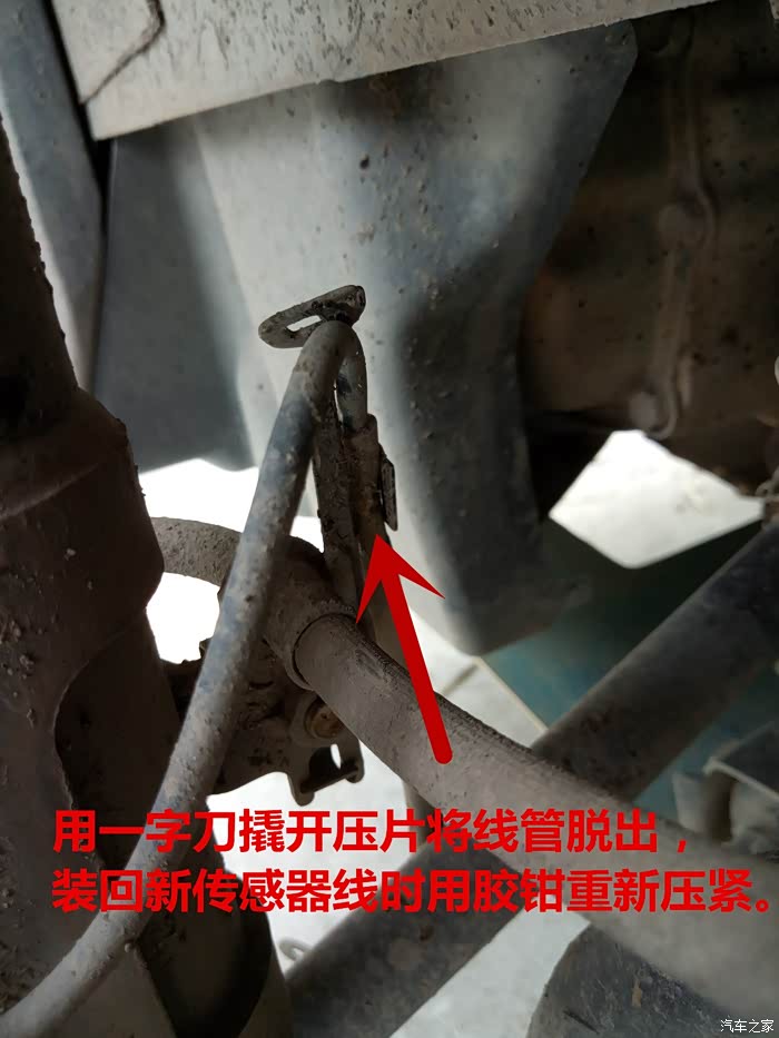 回到这边,顺着线,旧传感器还有段没拆掉,如图,这个地方,有个扎带,剪掉。自备一根扎带,新的也照样安装上去。如果没有扎带,找根小铜丝绑一下也是可以的。