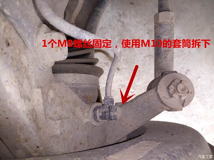 用M10的套筒拆下红箭头所指的一个螺丝,这块铁片用于夹住固定传感器的线,新的线也要用,所以用一字刀撬开脱出,装到新线上去。