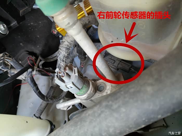 这边顺便说一下右前轮传感器的插头位置,它就躺在方向助力油储存罐下方的车身大梁上,摸进去也有点难度,不过比左边要好很多。