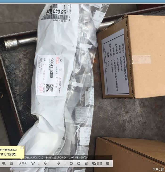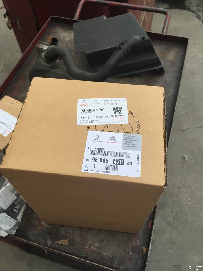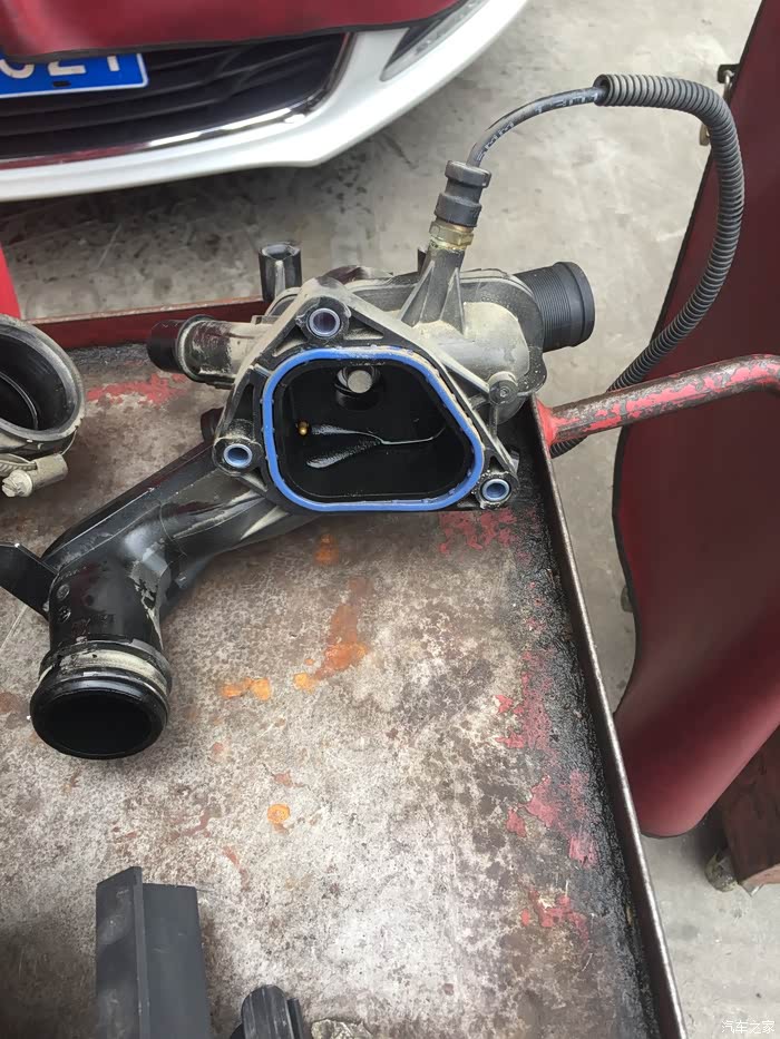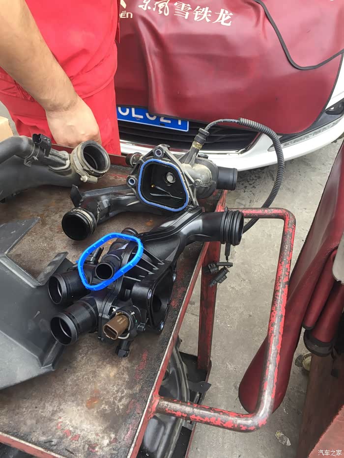 拆下来的出水室,新旧对比下,看不出哪儿坏了,问师付,师付说是上面的一个节温器坏了,是电控的,必须得整 个更换,给厂家提个建议啊,为啥不单独出个节温器啊,