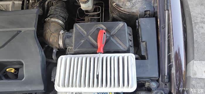 打开车头盖,准备更换空气格。用十字螺丝刀拧开螺丝,打开盖子,按照旧的摆放好就可以了