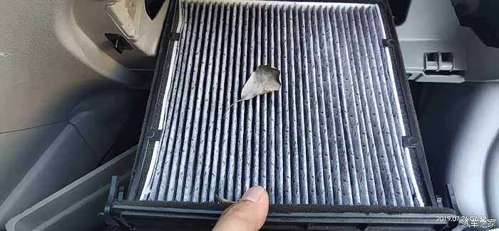 双手拔出来后就可以进行更换了,我车偶尔会停树底下,所以每次打开滤芯都能看见树叶,这次的还好。比较少的。