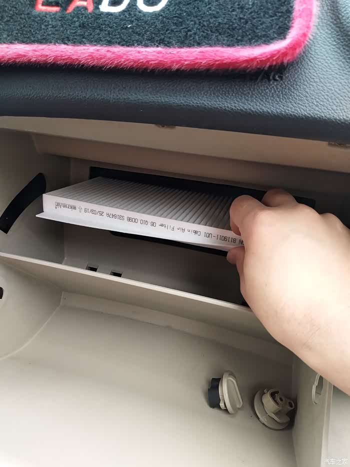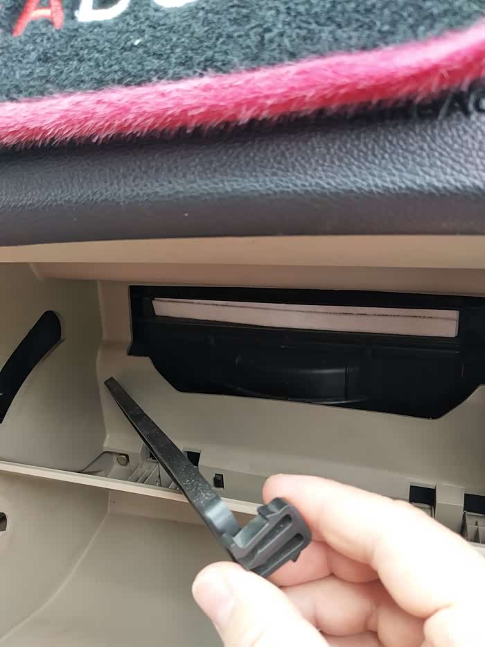 黑色卡扣摘下来(原来)空调滤芯就在面前,轻轻的从里面抽出俩即可