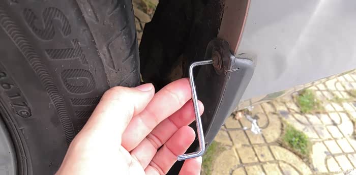 这是被刮烂的挡泥板,用铁丝临时扎了一下