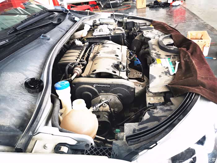 拉开引擎盖,发动机舱的全面检查就这么速速的开始啦。话说,这发动机舱够脏的啊,不过没关系,师傅说,他一会会清理干净的,特别交代,不能自己弄,会烫伤手的。
