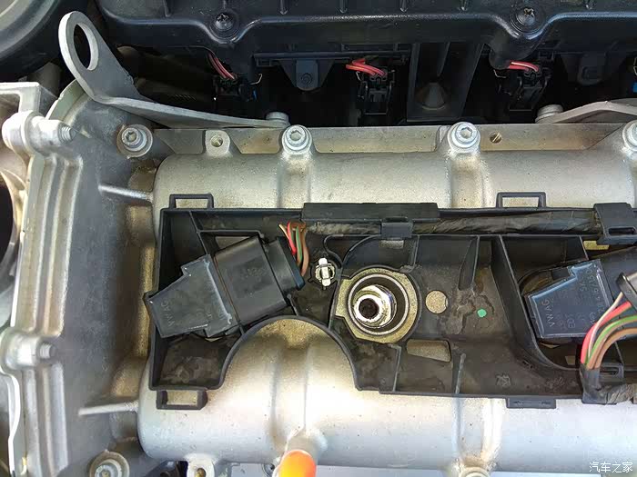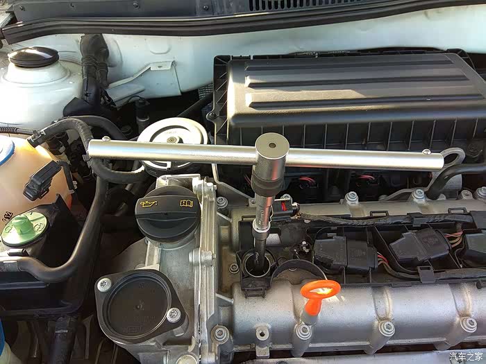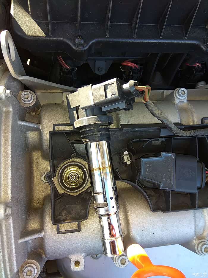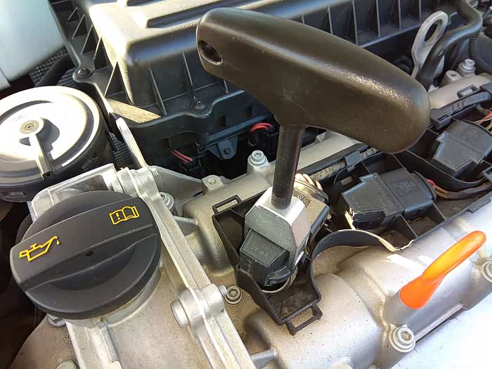 点火线圈拉出来的位置(刚刚好),因为需要弯腰操作,实际操作起来用不上力道。还有重要的一点提醒:向上拉的行程一定要控制好,不要把线束扯断了。