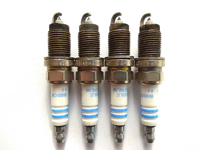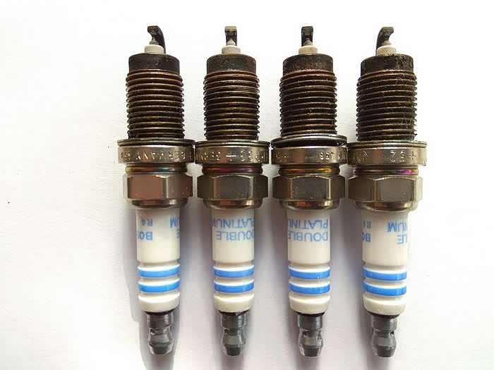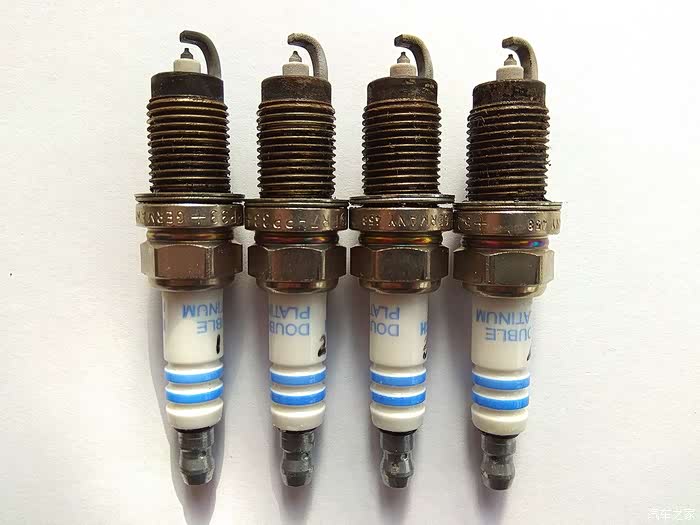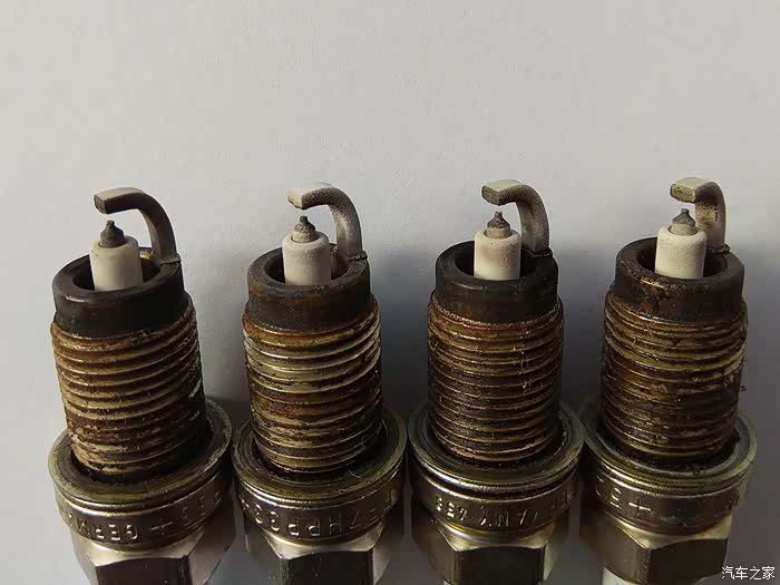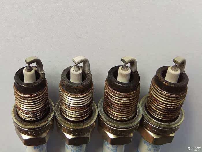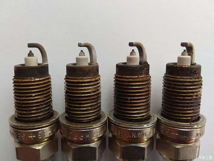 火花塞燃烧情况观察,从左至右1、2、3、4缸。从图片看,电极及绝缘体均为灰白色,燃烧状况良好!