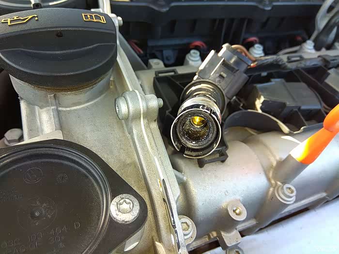 第4缸线束短,所以要在点火线圈刚刚拉出后(图示的位置,尚在缸筒内),先拿掉插头,才可以拉出点火线圈。