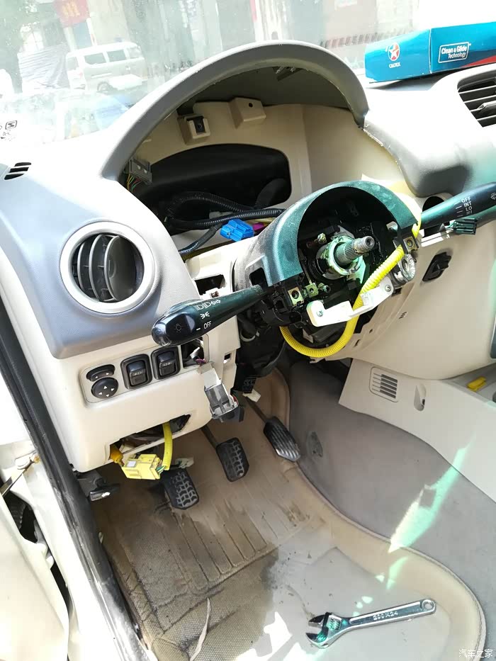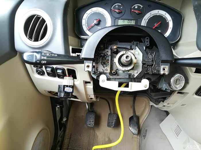 1、开拆,为了方便操做,减少工作量,做到尽量少拆原件,先拆下方向盘下的两个挡板,卸下方向盘。(ps:最开始开拆的是驾驶位座椅,方便后面的拆卸工作,由于刚开始没有拍照,就不上图了,卸下四个角的螺丝,前后左右松动一下,一抬就出来了)