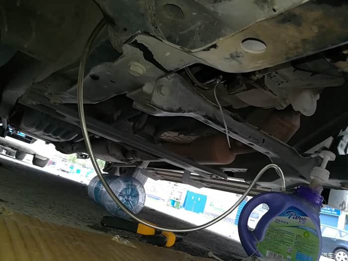 9、趴车底,祭出手工抽油神器(临时制作,用料便宜,制作时要用较硬的朔料瓶,抽空压头可以用沐浴露的压头,用AB胶或热熔胶做好密封操作,做到不漏空)。把抽油器的抽油管连接在分泵的排空接口,防止漏空,先压几下抽油神器的抽空压头直到瓶身有内凹,接着拧松出油口,抽油神器自动把离合油抽出,期间要手动压抽油器的抽空压头,保持瓶身有一点内凹,直到抽出的有完全没有气泡,拧紧分泵的排空螺丝,卸下胶管,套上防尘头,抽空完成。(ps:期间注意让人关注离合油壶的油位,不能流干,要及时加油!!)