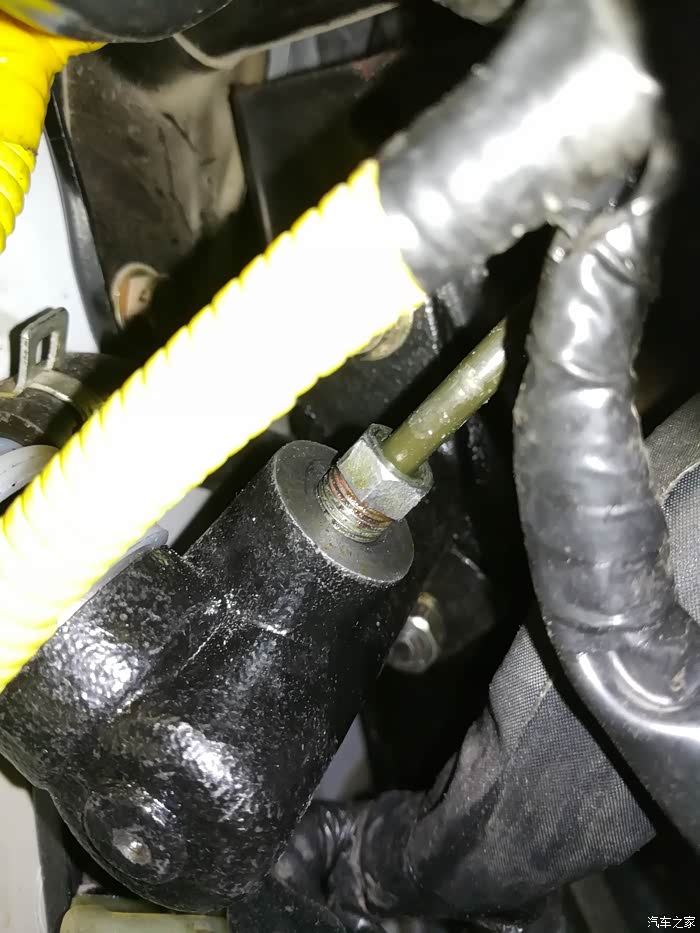 7、分泵由于一个人在车底操作,没有拍照,就是这个,趴车底拧松放油螺丝,用容器接住旧离合油,直到放干旧离合油。先拆离合油输入管,再拆两颗固定螺丝就卸下分泵了,反顺序安装新分泵,先把顶针位置放好,上两颗固定螺丝,再安装离合油输入管。