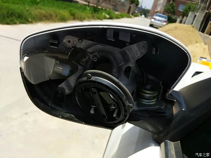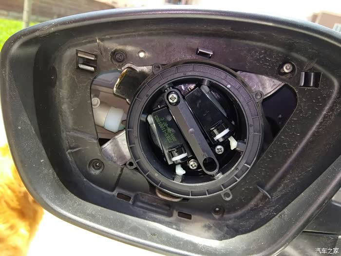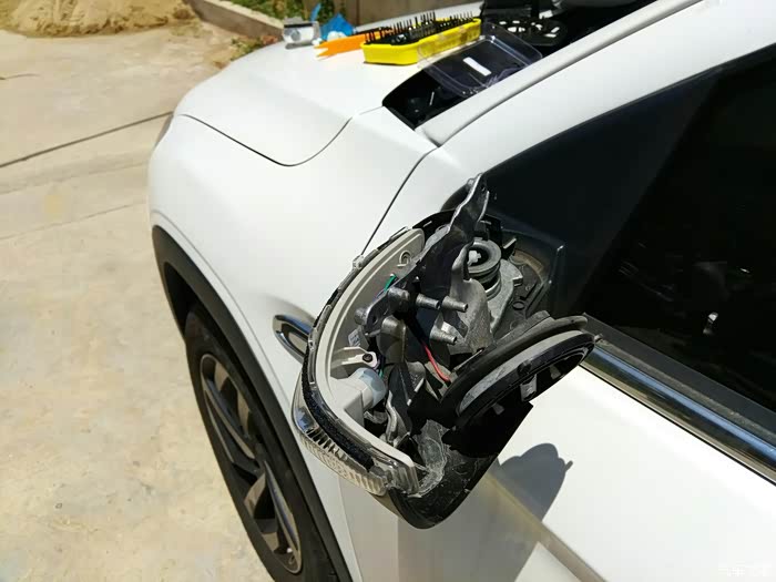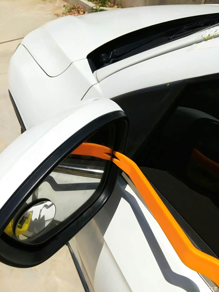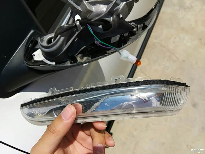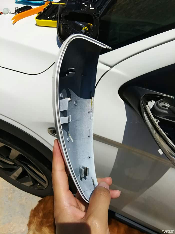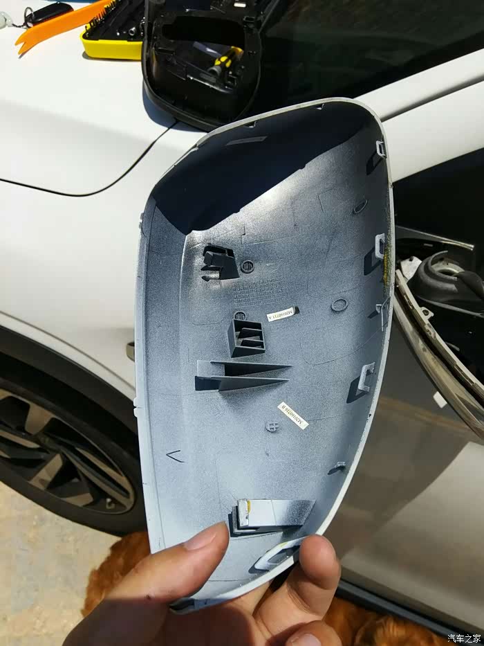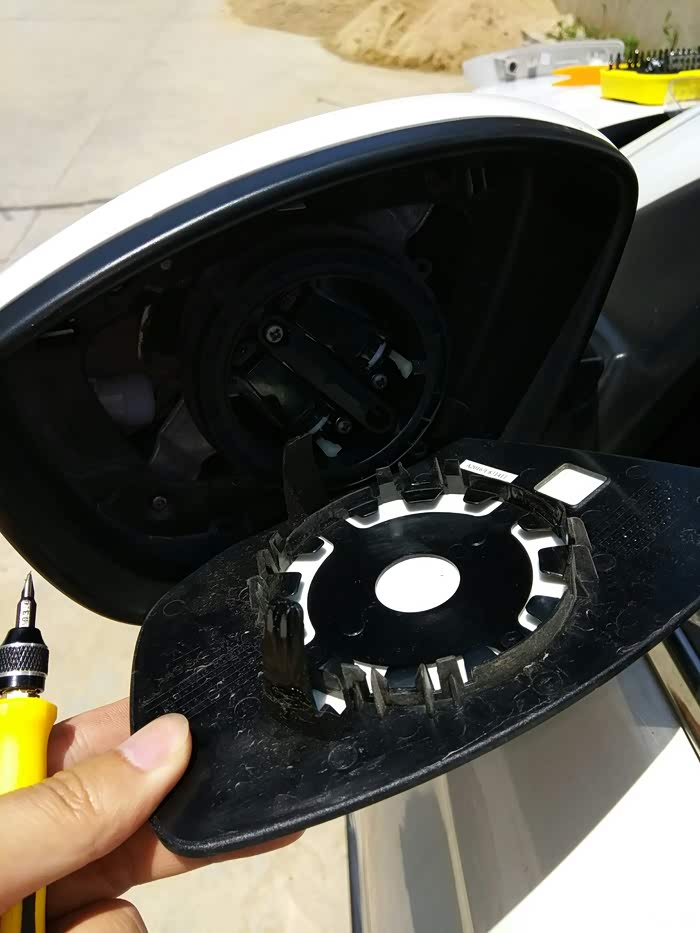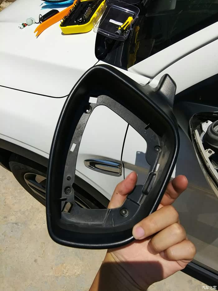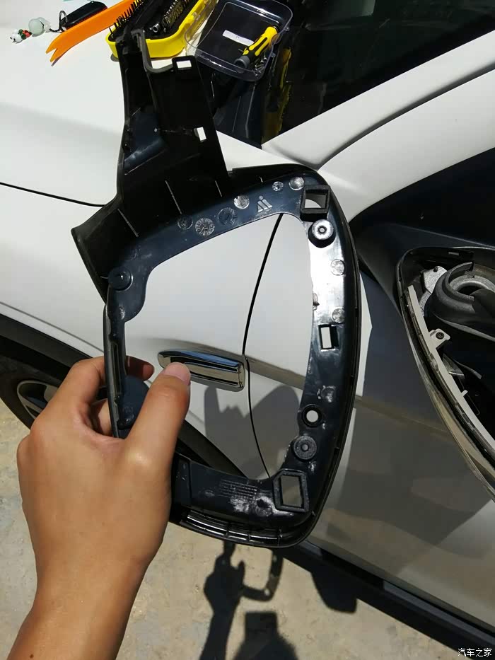 准备卸下后视镜的黑色边框,边上的几个卡扣记得弄一下才能拆下来。