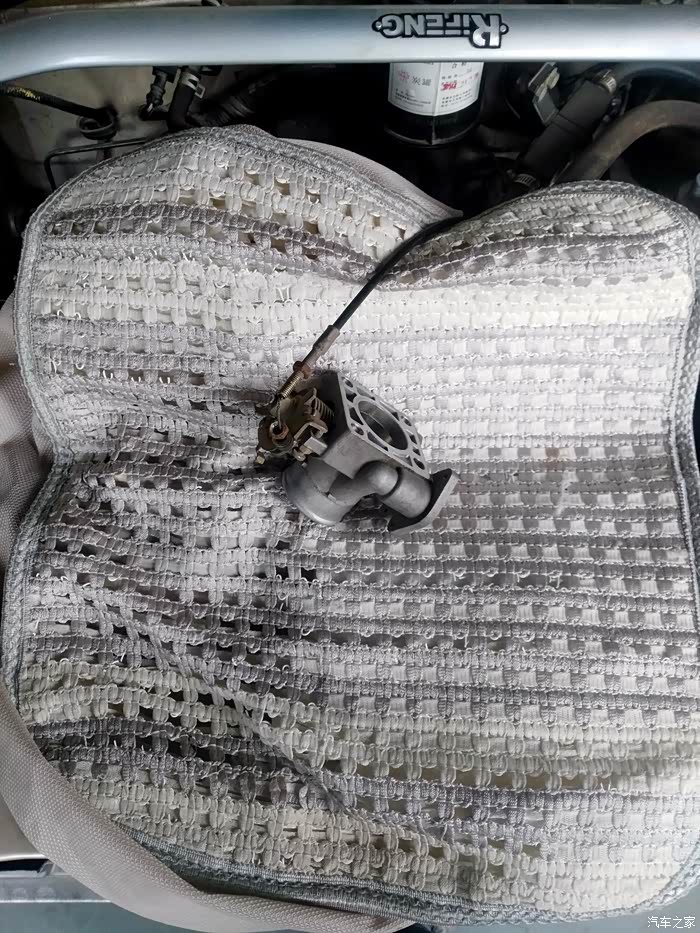 拆下一堆部件,进气管道张着口,随便掉个东西进去就是大动干戈的事,旧坐垫是防尘罩。