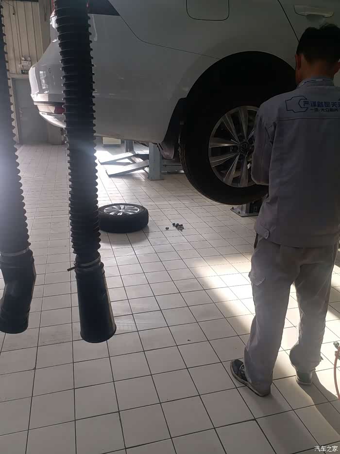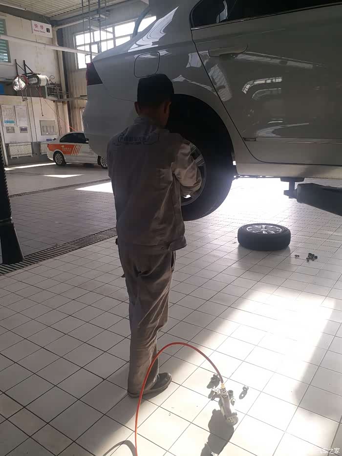 服务顾问直接把车开进车间给我换胎,给我换胎的是一位小师傅,不过干起活来还是比较认真的,他先把我原来的轮胎拿下来之后再把我带来的四季胎换上
