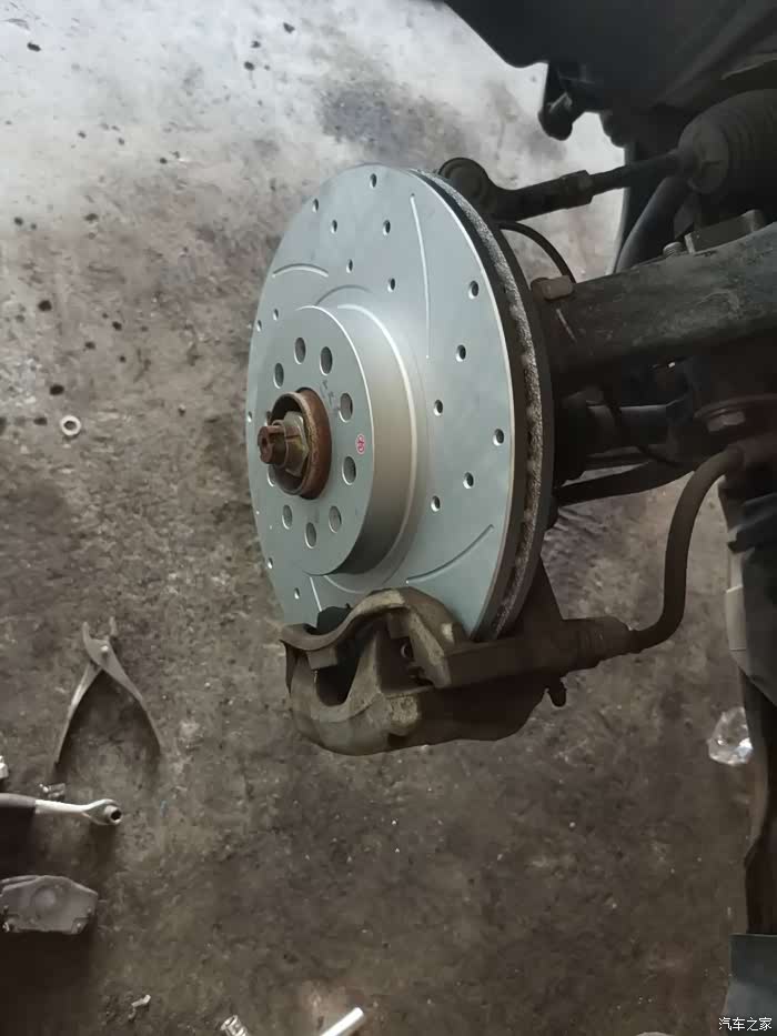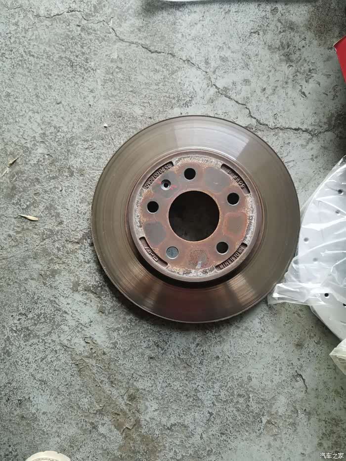 原车更换下来的,跑了18万公里的刹车盘,已经磨下去很深了,沟沟壑壑的