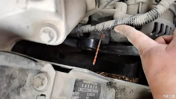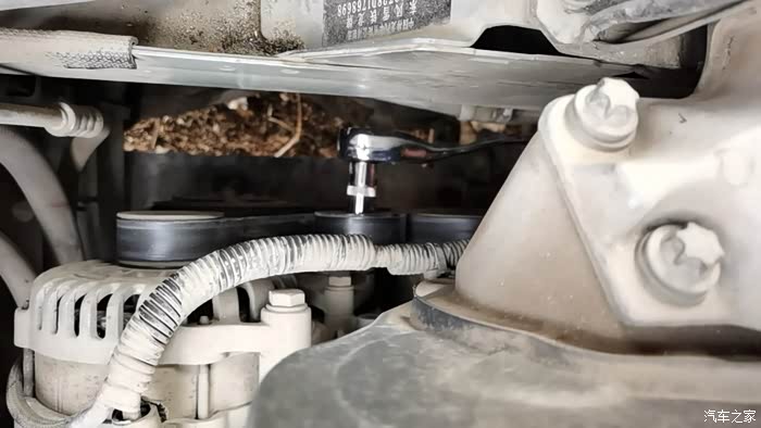 取旧皮带,荆轮扳手从空调滤芯口下方往上提,因为长时间不动,从前方搬不动