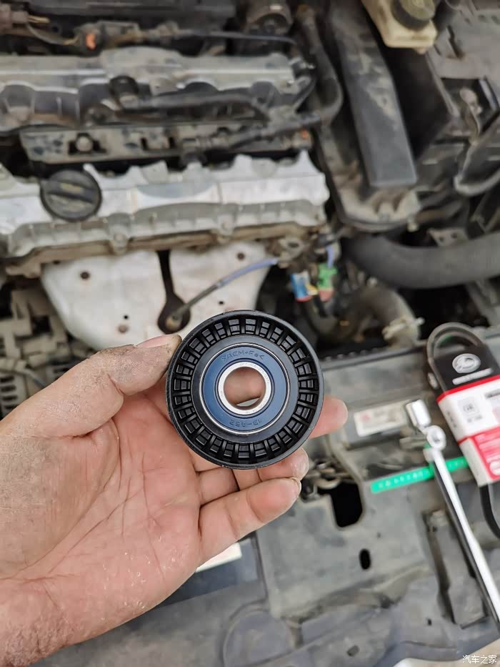涨紧轮,本次更换本着节约不浪费,涨紧器不用换,涨紧轮必须更换,因为旧的已经磨出台了,会加快磨损新皮带