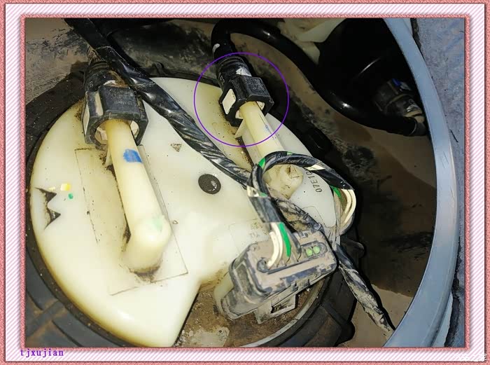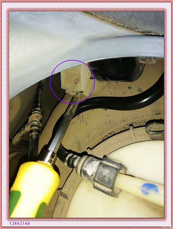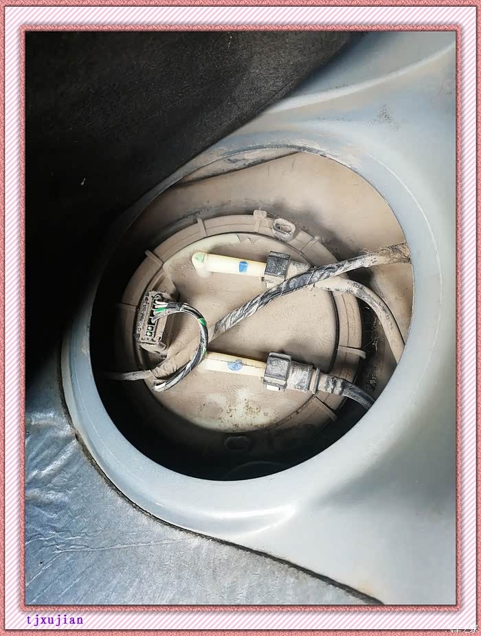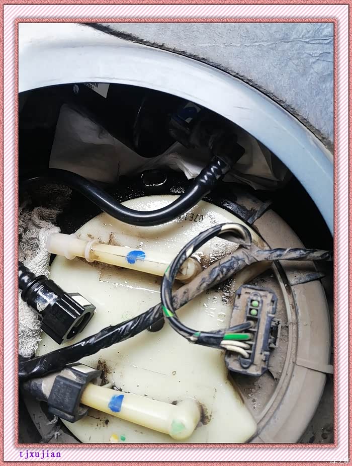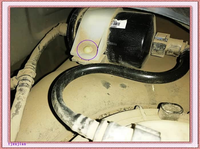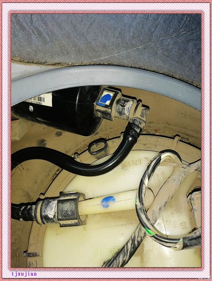 油箱这头的油管拔掉后,盖上了白色塑料小盖子。