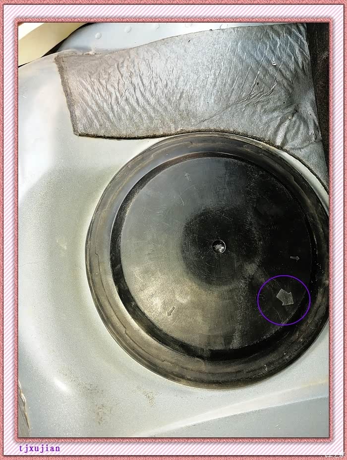 掀起毛毡后露出这个黑色圆盖,用手掀开一个小口,然后往箭头方向掀起。