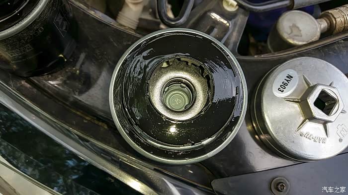 将新机滤的胶垫涂上机油,准备安装。