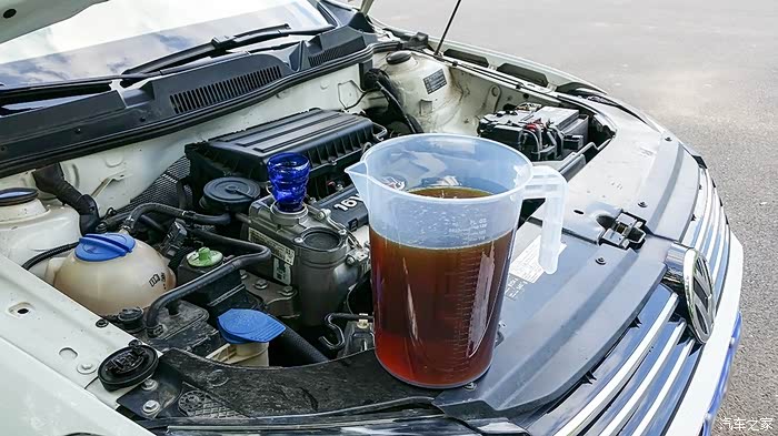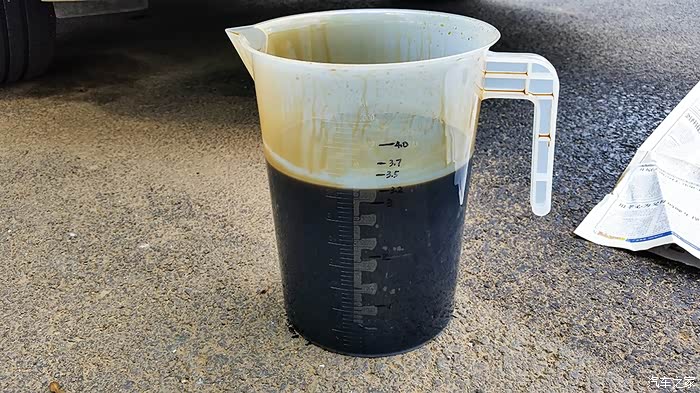 准备了一个新的量杯,准备加入新油。总共加了3次,共计3.8升,油尺为最高点。
