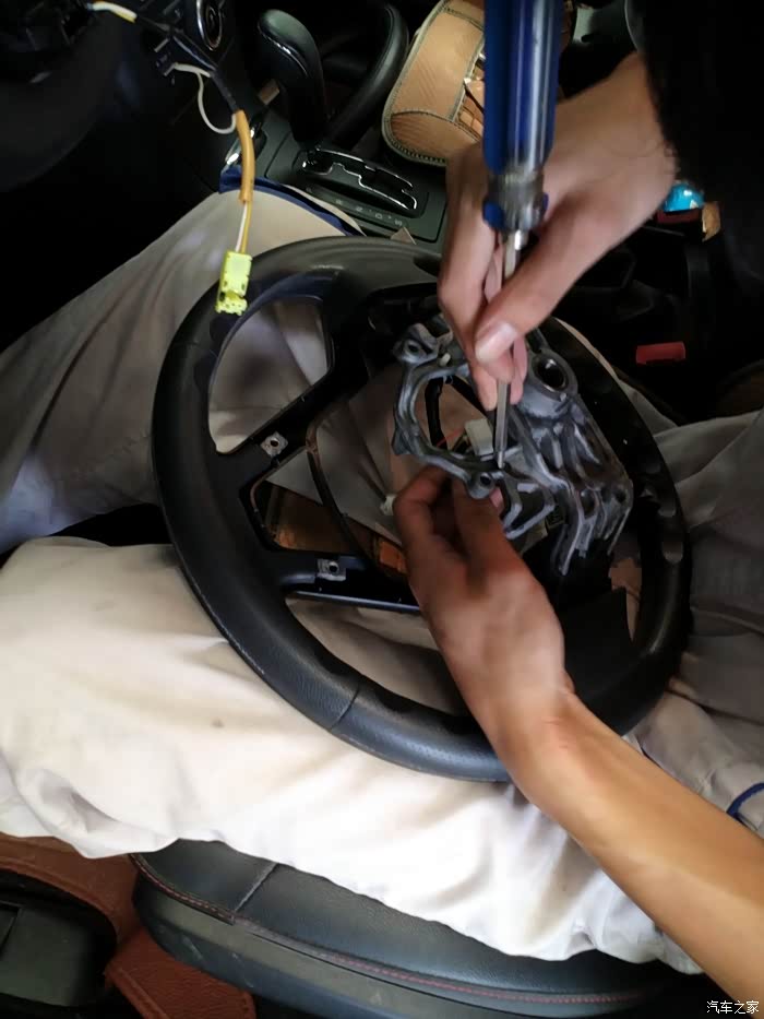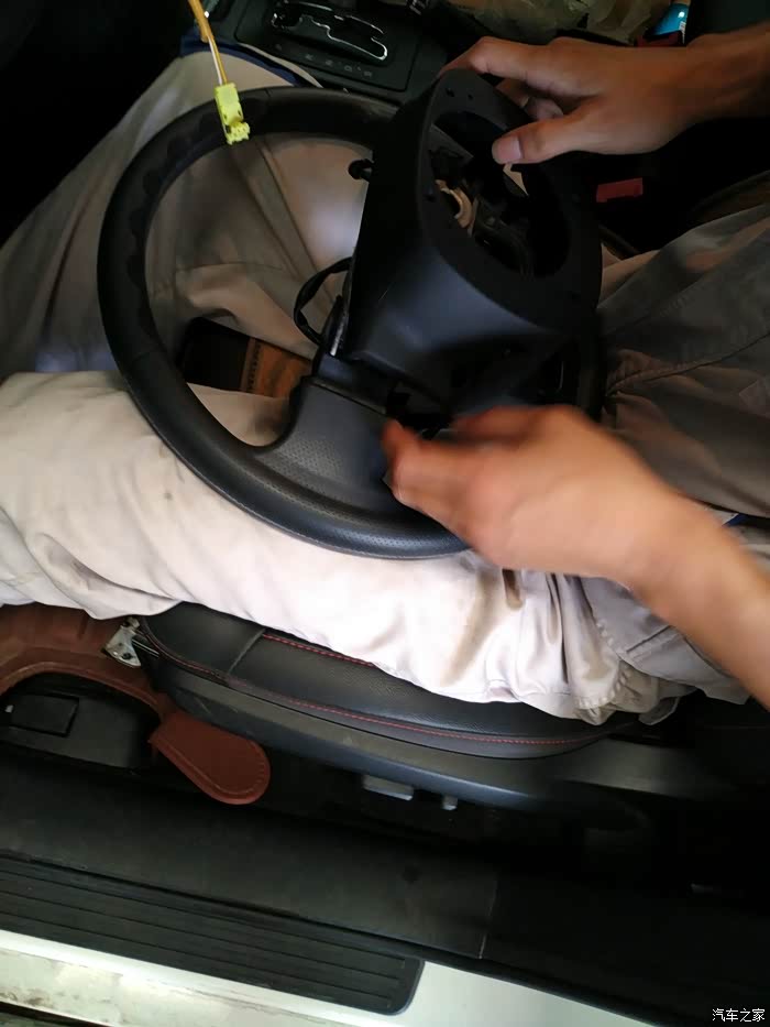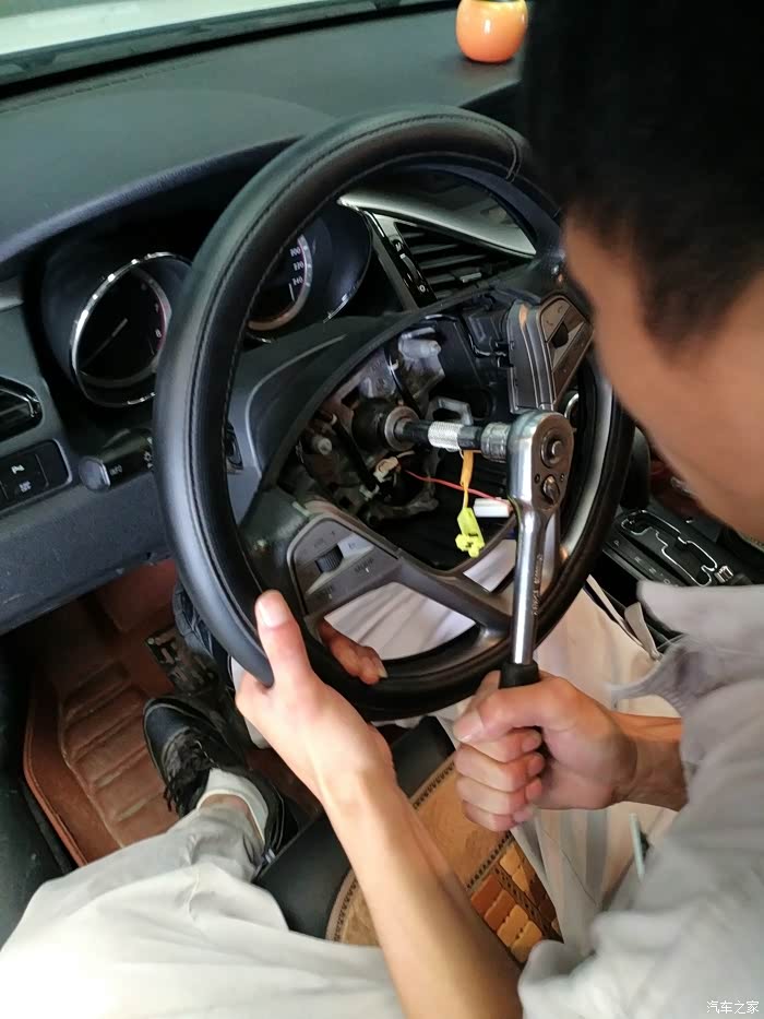 大套筒要拆方向盘了,仅有一个大螺丝,拆掉后方向盘可以拔下,这个稍微费点力,