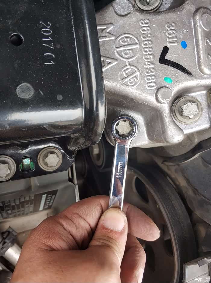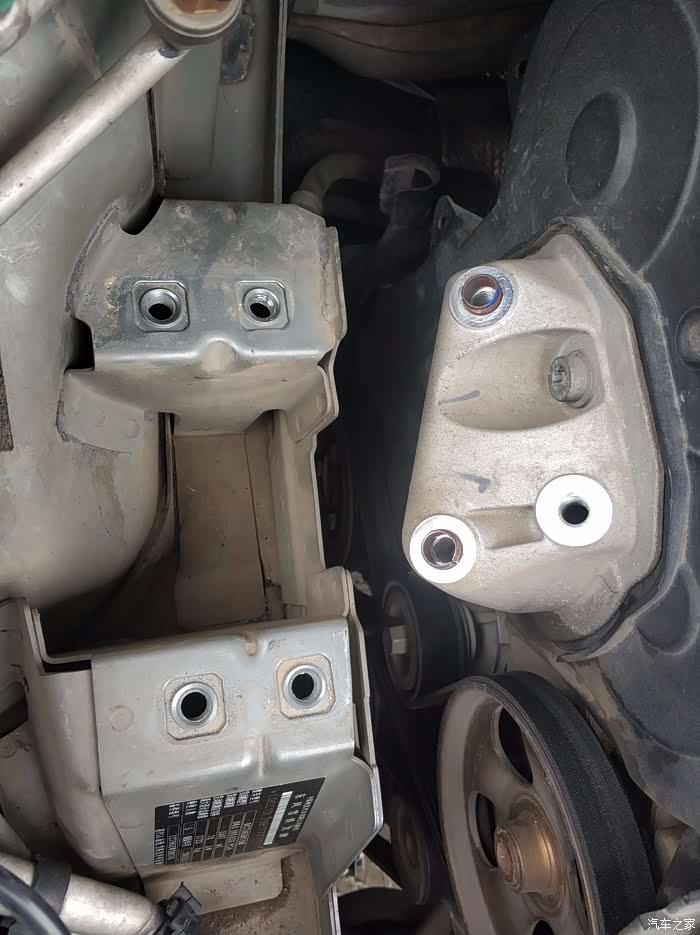 发动机侧的螺孔上有两个定位的钢套,上面的那个没有,拆下来的时候发动机有错位,回装的时候要调整发动机下面的千斤顶的高低,同时还要晃着发动机,不然螺丝相当不好上,最好有2个人,一个人用撬棍矫正发动机位置,另一个人上螺钉。