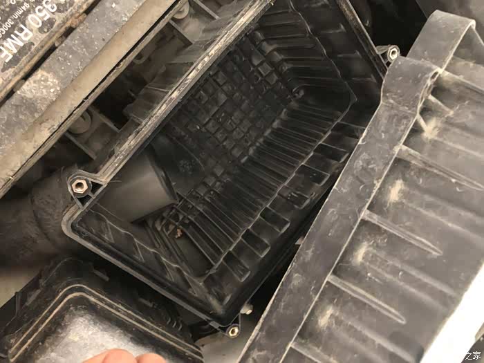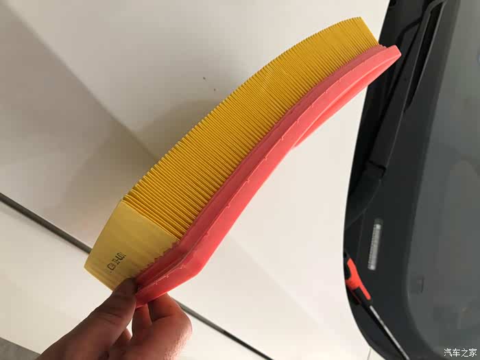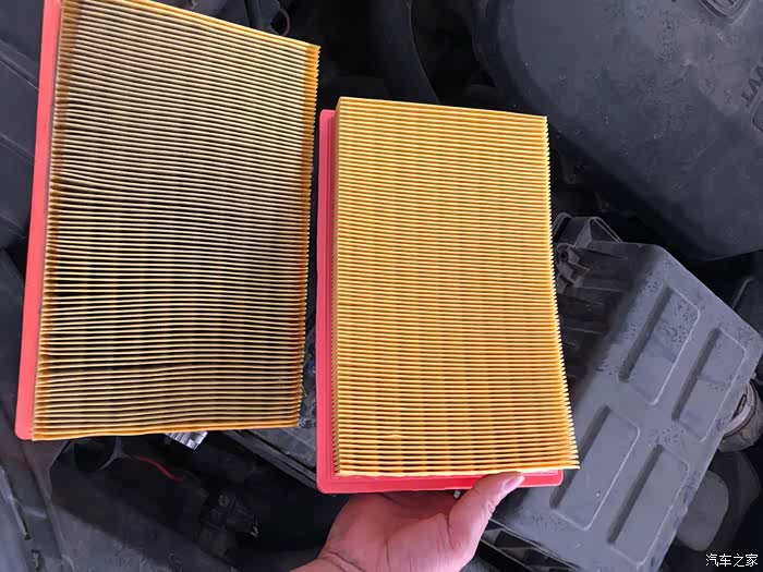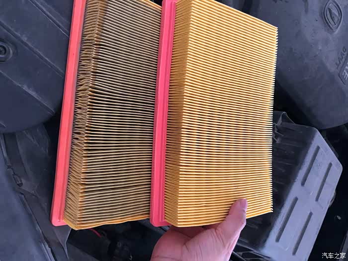 翻看发现用过的空气滤清器布满很多灰尘和杂物。