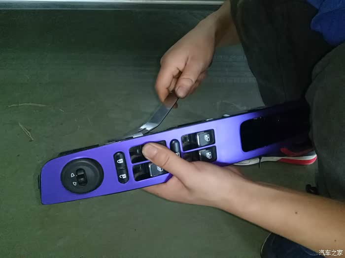 升降器总成,更换的步骤很简单,拿翘板,在边上轻轻往上一撬,就可拿下来了,底下有两个线头连接,拆开就可以把升降器开关拿下来了。