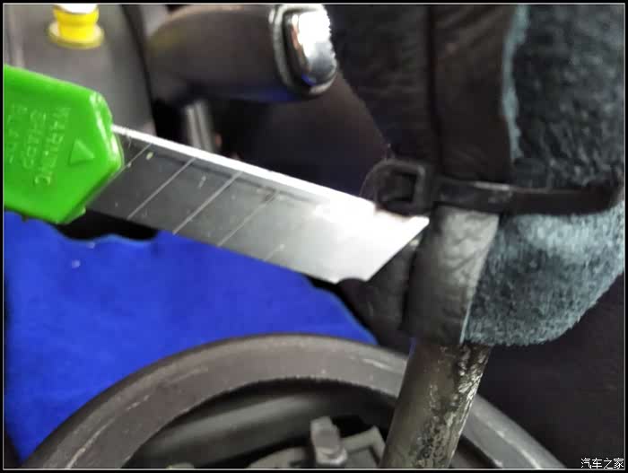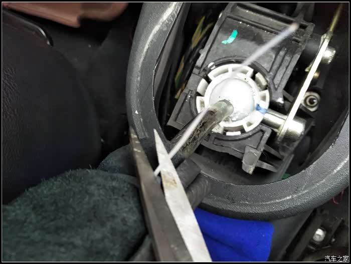 好了继续说挡把,用小剪刀把扎带剪断后,把防尘罩往下面压,还原到原来的位子。